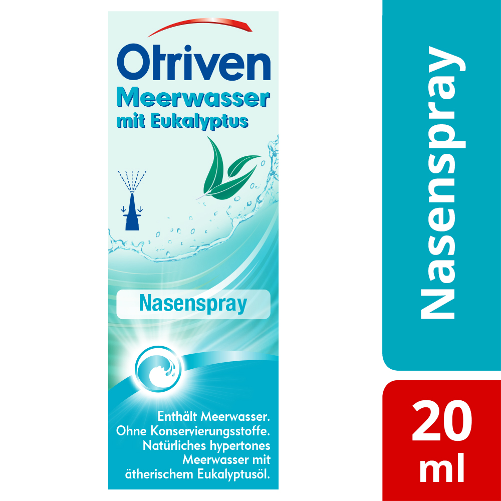 Otriven Meerwasser mit Eukalyptus Sofortiges Gefühl der Linderung und Frische Otriven Meerwasser mit Eukalyptus hilft, Bakterien und Viren durch Erweichen und Lösen überschüssigen Nasenschleims zu entfernen. Aufgrund der hypertonen Salzkonzentration von 2,2 % hat das Nasenspray einen natürlich abschwellenden Effekt und befreit die Nase ohne die Schleimhaut auszutrocknen. Wenn die nasalen Symptome nach 7 Tagen weiterhin bestehen, suchen Sie eine medizinische Fachperson auf. Otriven Meerwasser mit Eukalyptus bietet Hilfe bei Schnupfen und kann auch zur Erleichterung des Sekretabflusses bei Nasennebenhöhlenentzündung eingesetzt werden. Das Nasenspray Otriven Meerwasser mit Eukalyptus ist für Erwachsene und Schulkinder ab 6 Jahren geeignet. Ihre Vorteile im Überblick Natürlich abschwellende Wirkung Sofortiges Gefühl der Linderung und Frische Hilft, Bakterien und Viren durch Erweichen und Lösen überschüssigen Nasenschleims zu entfernen Besitzt befeuchtende Eigenschaften Ohne Konservierungsstoffe Anwendungsgebiete von Otriven Meerwasser mit Eukalyptus Otriven Meerwasser mit Eukalyptus ist ein natürliches, intensiv abschwellendes Nasenspray, das die aufgrund einer Erkältung und Nasennebenhöhlenentzündung (Rhinosinusitis) zugeschwollene oder verstopfte Nase durch Abschwellen der Nasenschleimhaut natürlich und wirksam befreit.