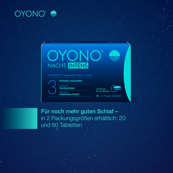 • Das Nahrungsergänzungsmittel OYONO® NACHT INTENS ist in der Packungsgröße 20 und 60 Tabletten erhältlich