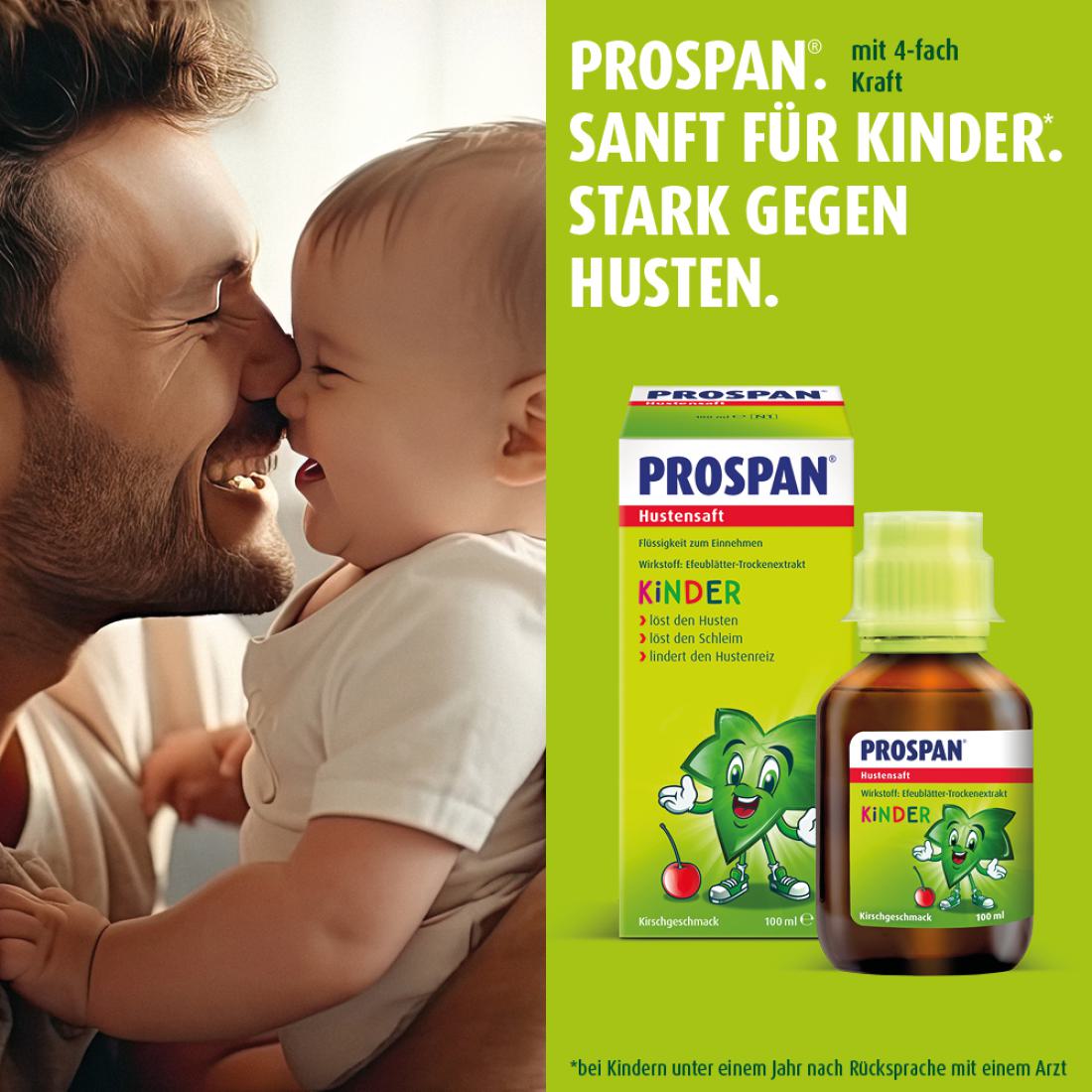 - PROSPAN®. SANFT FÜR KINDER. STARK GEGEN HUSTEN: Prospan® Hustensaft mit dem einzigartigen Efeu-Spezial-Extrakt EA 575® befreit von Husten und Bronchitis, indem er den Hustenreiz lindert, festsitzenden Schleim löst, die Bronchien erweitert und die Entzündung lindert – damit Ihr Kind schnell wieder gesund werden kann.