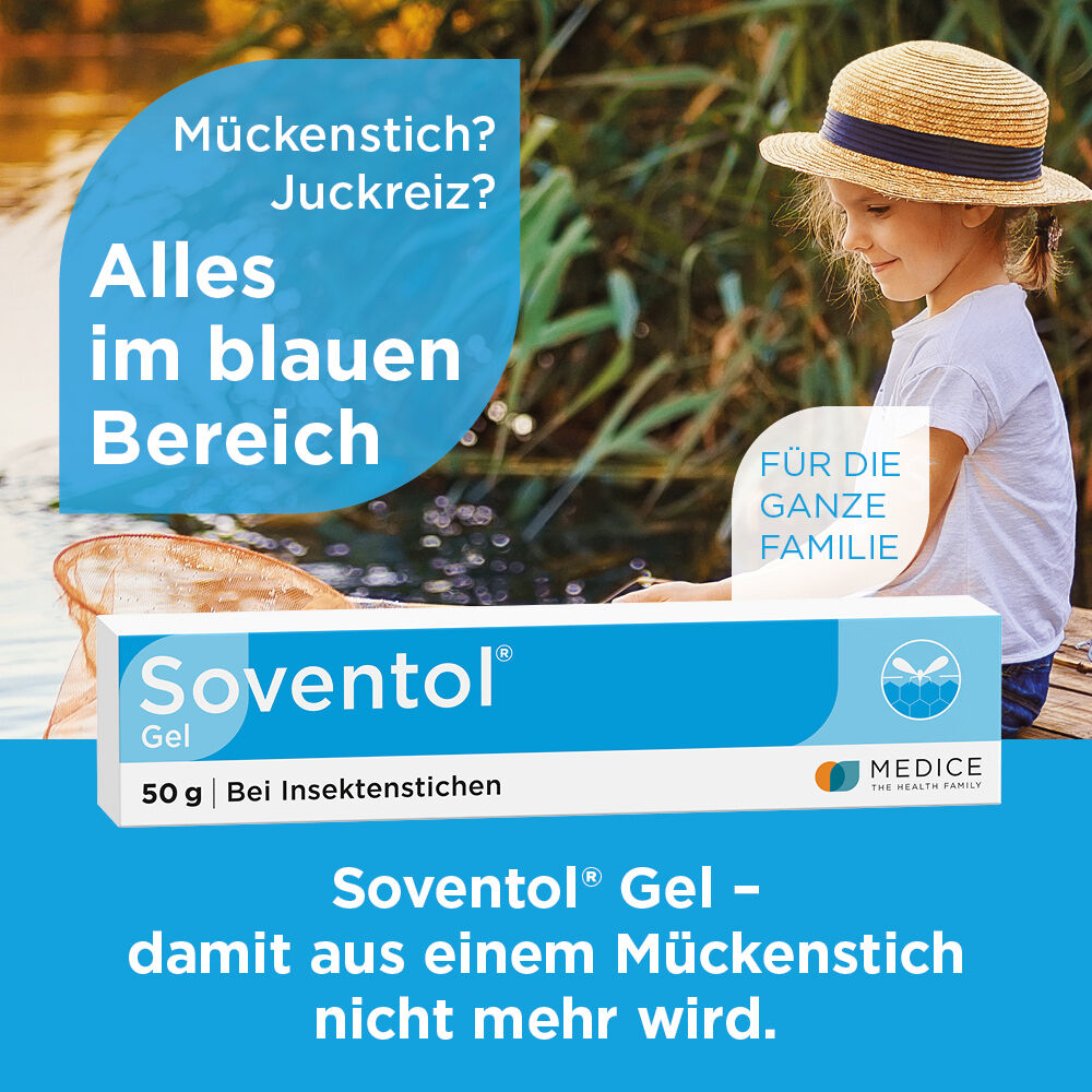 Bei Insektenstichen ist Soventol® Gel ein echter Klassiker für die ganze Familie! Es nimmt die Rötung und lindert den Juckreiz – schnell und langanhaltend zugleich. Denn nur Soventol® Gel enthält das Antihistaminikum Bamipin, das für seinen schnellen Wirkeintritt und den langen Wirkeffekt bekannt ist. Dies wurde in unterschiedlichen Studien bereits mehrfach gezeigt. Dank der sehr guten Verträglichkeit ist Soventol® Gel bereits für Kleinkinder geeignet.