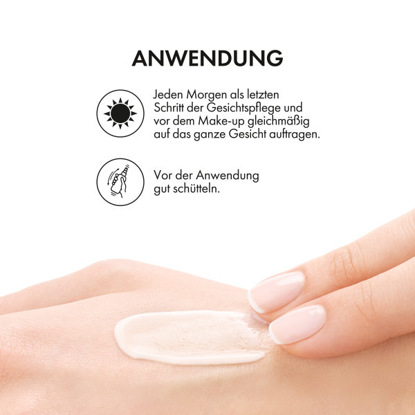 • Der Sonnenschutz mit LSF 50 wirkt sonnenbedingten Hautschäden entgegen, indem durch UV-Strahlung hervorgerufenen Pickelmalen vorgebeugt wird.