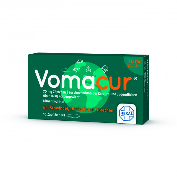 Vomacur 70 mg Zäpfchen. Wirkstoff: Dimenhydrinat. Anwendungsgebiete: zur Vorbeugung und Behandlung von Reisekrankheit, Schwindel, Übelkeit und Erbrechen.