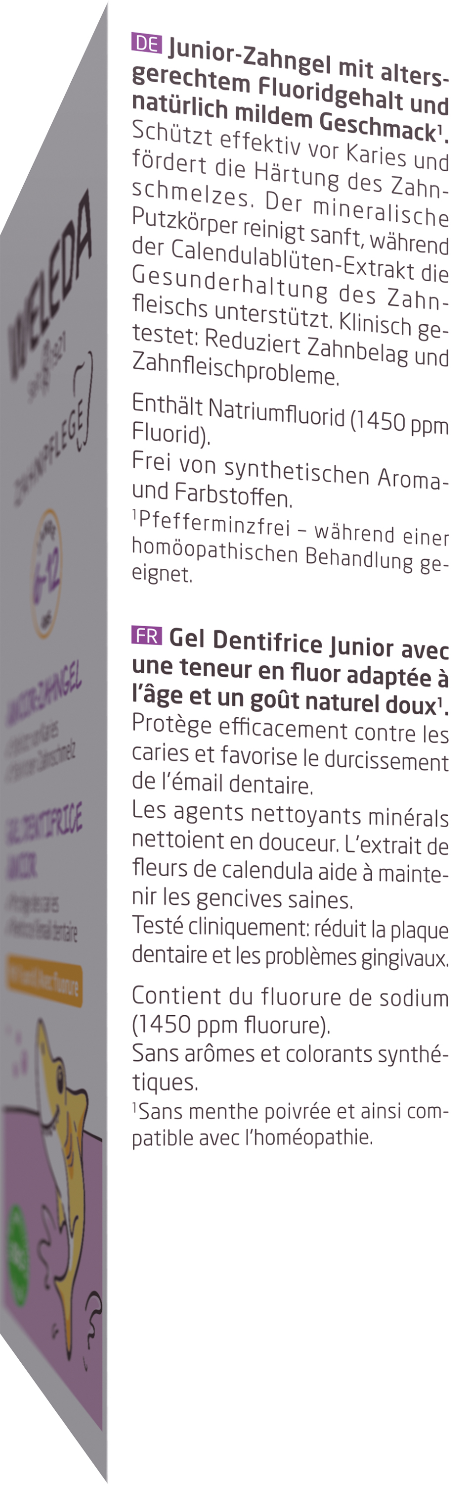 Unser neues Junior-Zahngel mit Fluorid haben wir speziell für die Zahnpflege bei Kindern ab 6 Jahren entwickelt. Sie mögen den angenehmen Geschmack der natürlichen ätherischen Öle. Der mineralische Putzkörper reinigt die Zähne sanft aber gründlich, während der Extrakt aus Calendulablüten das Zahnfleisch unterstützt, gesund zu bleiben. Das Zahngel enthält keine Pfefferminze und ist deshalb auch während einer homöopathischen Behandlung geeignet.