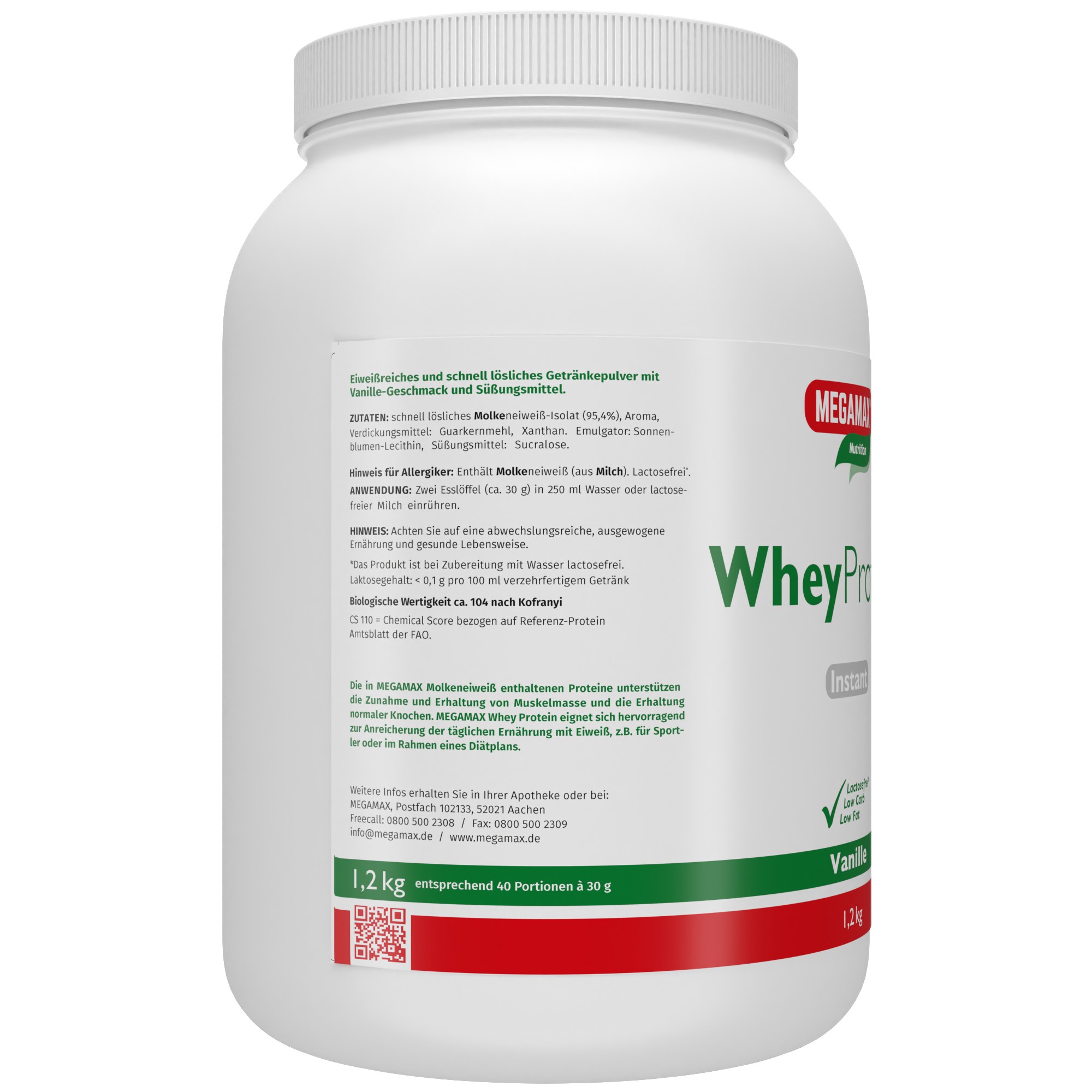 Zwei Esslöffel (ca. 30 g) in 250 ml Wasser oder lactosefreier Milch einrühren und mit dem Megamax-Mixbecher ca. 30 Sekunden lang kräftig schütteln. Das Produkt ist bei Zubereitung mit Wasser oder Sojamilch lactosefrei (unter 100 mg Lactose pro 100 ml verzehrfertigem Getränk).